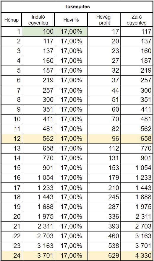 Nagyon nagy potenciál rejlik a kamatos kamatban főleg ha havi 15-17% ez a kamat. 1 év alatt akár ötszörözni is lehet a pénzt amit befeketetsz